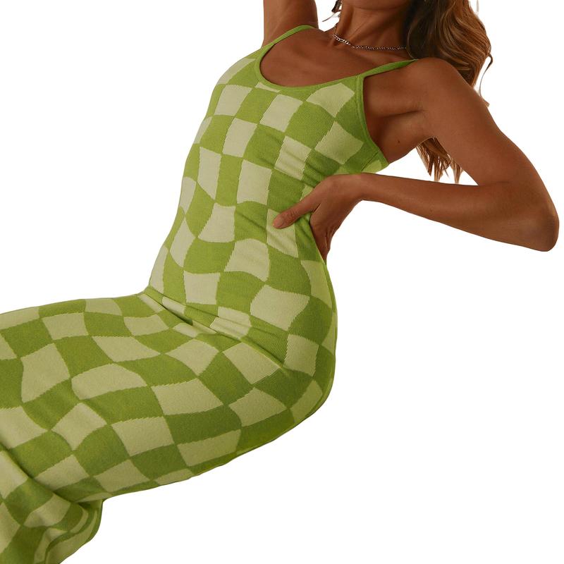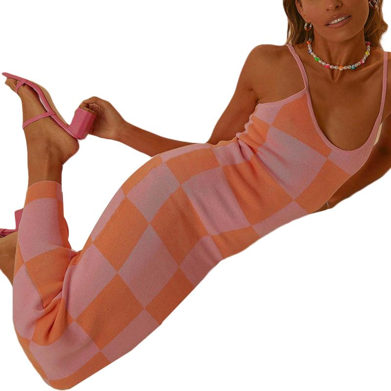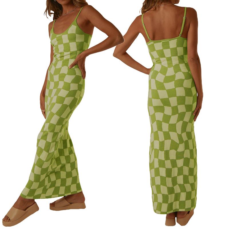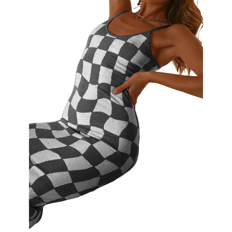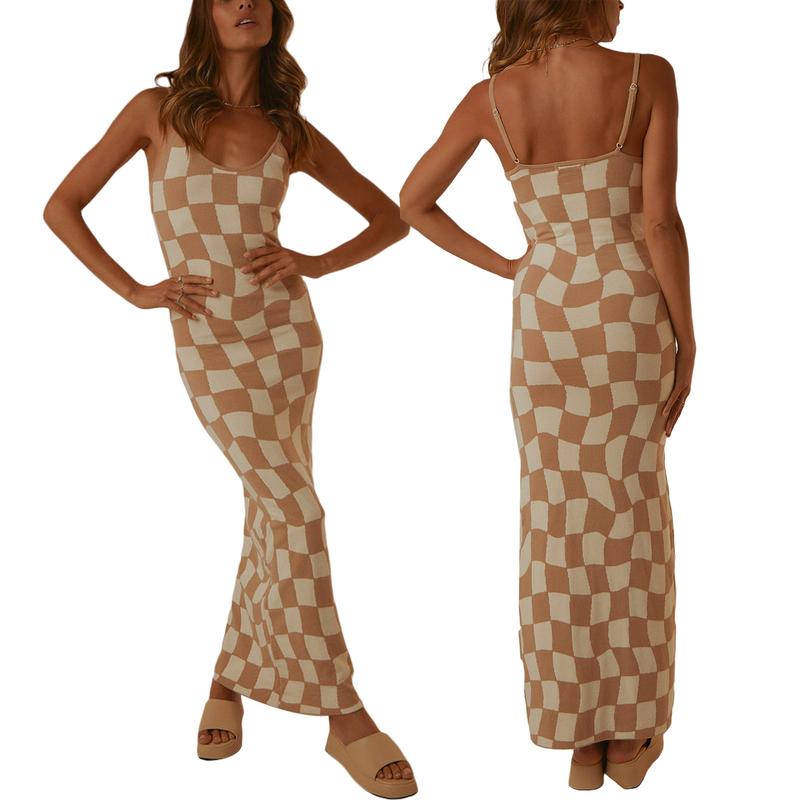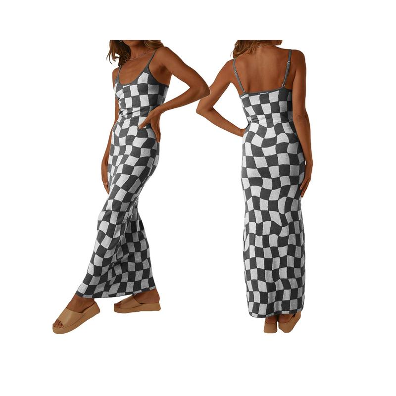 Women´s Summer Long Cocktail Dress Sleeveless Checkerboard Print Spaghetti Strap Dress
