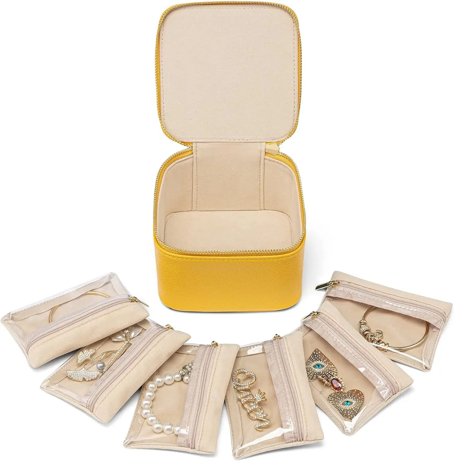 Lychee grain leather jewelry storage box, including 6 velvet transparent storage bags, can be carried separately or placed inside the jewelry box storage, to prevent jewelry oxidation affect the use.